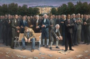 Some may already be familiar with the image featured above. For those who aren’t, it is painting titled “The Forgotten Man” which features President Obama trampling on the Constitution while an astonished James Madison pleads with him to stop. To the side, a man sits on a park bench in the throes of depression while 43 presidents look on. The painting, which uses discarded dollar bills and scraps of paper with individual constitutional amendments scrawled onto them.